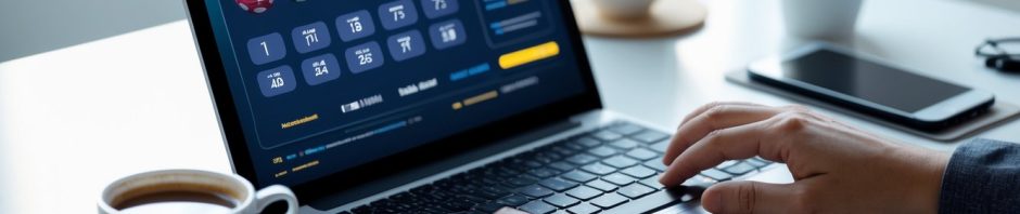 Sebuah ruang kerja modern dengan laptop yang menampilkan situs togel online, tangan seseorang sedang mengetik, dan suasana kantor yang bersih dan terang.