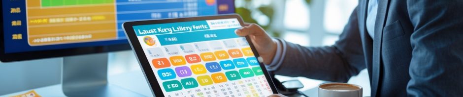 Seseorang sedang menganalisis hasil togel terbaru di sebuah meja dengan layar digital dan perangkat elektronik di kantor yang terang.