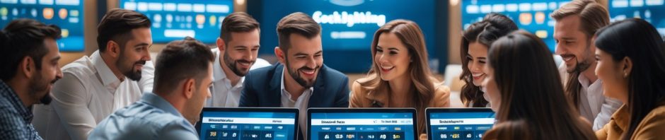 Orang-orang sedang bertaruh di lingkungan modern dengan layar digital dan suasana yang ramai.