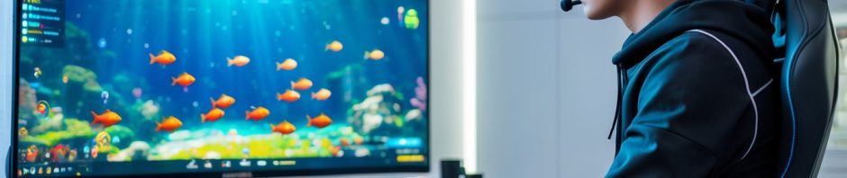 Seorang pria muda duduk di depan komputer dengan layar menampilkan permainan tembak ikan yang berwarna-warni, fokus bermain di ruangan gaming yang rapi dan terang.