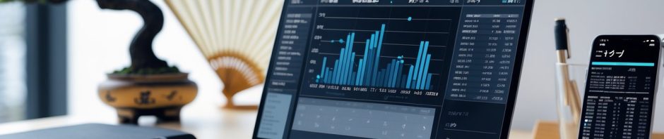 Sebuah ruang kerja modern dengan laptop menampilkan grafik statistik lotere Jepang, dikelilingi oleh alat tulis dan ponsel, dengan elemen budaya Jepang di latar belakang.